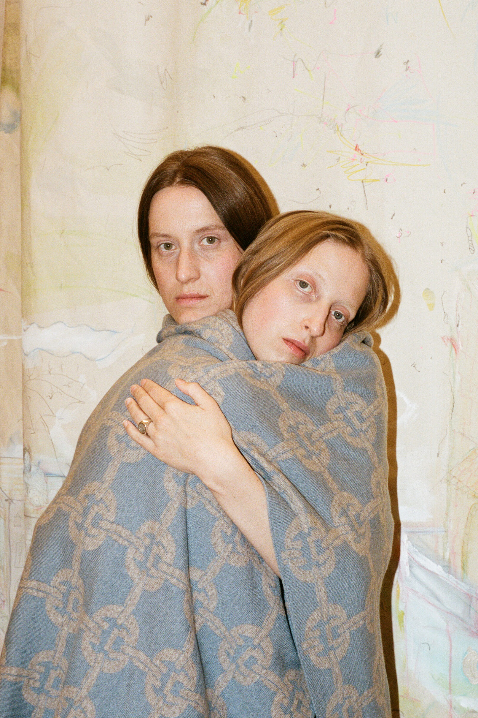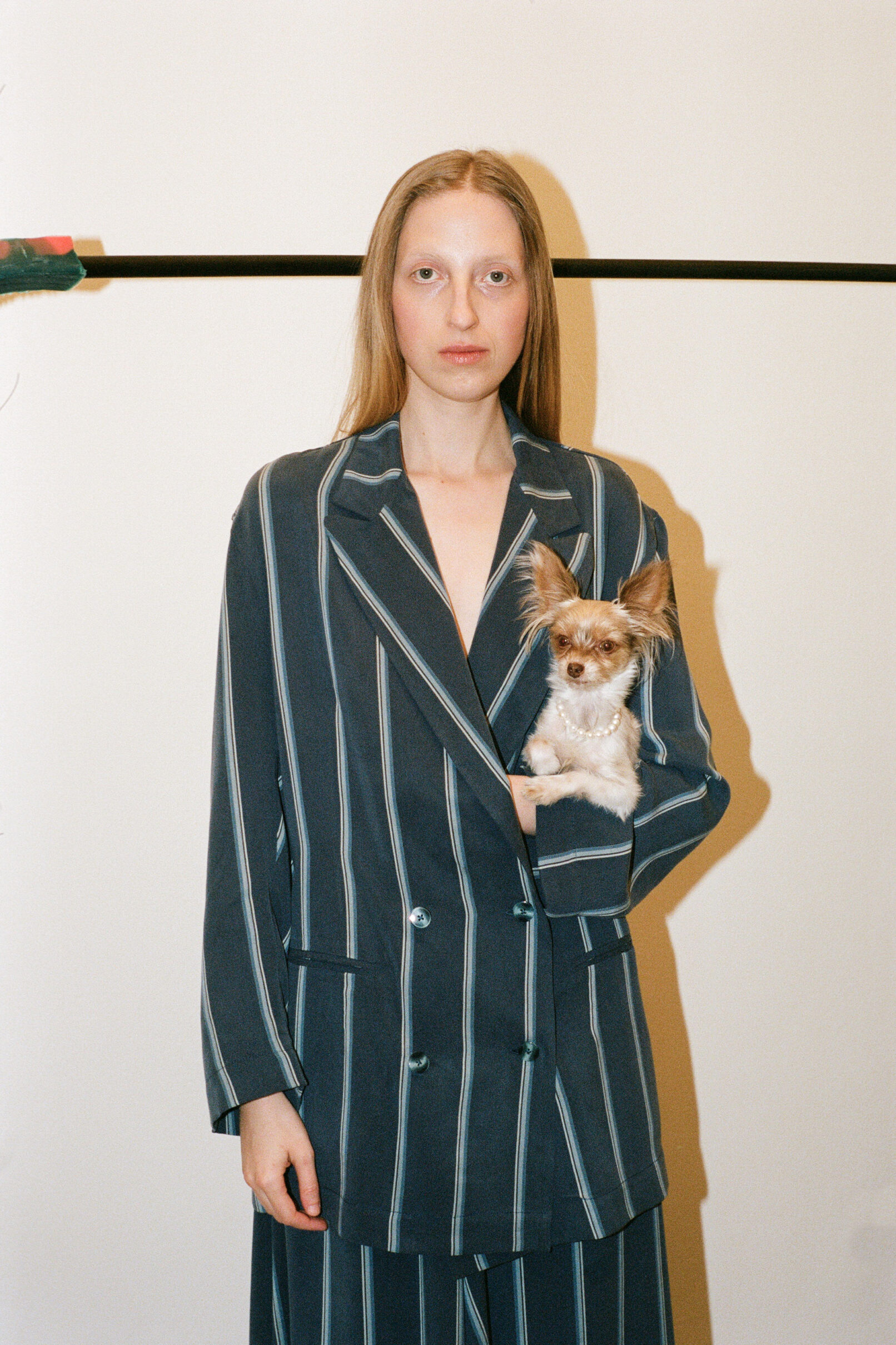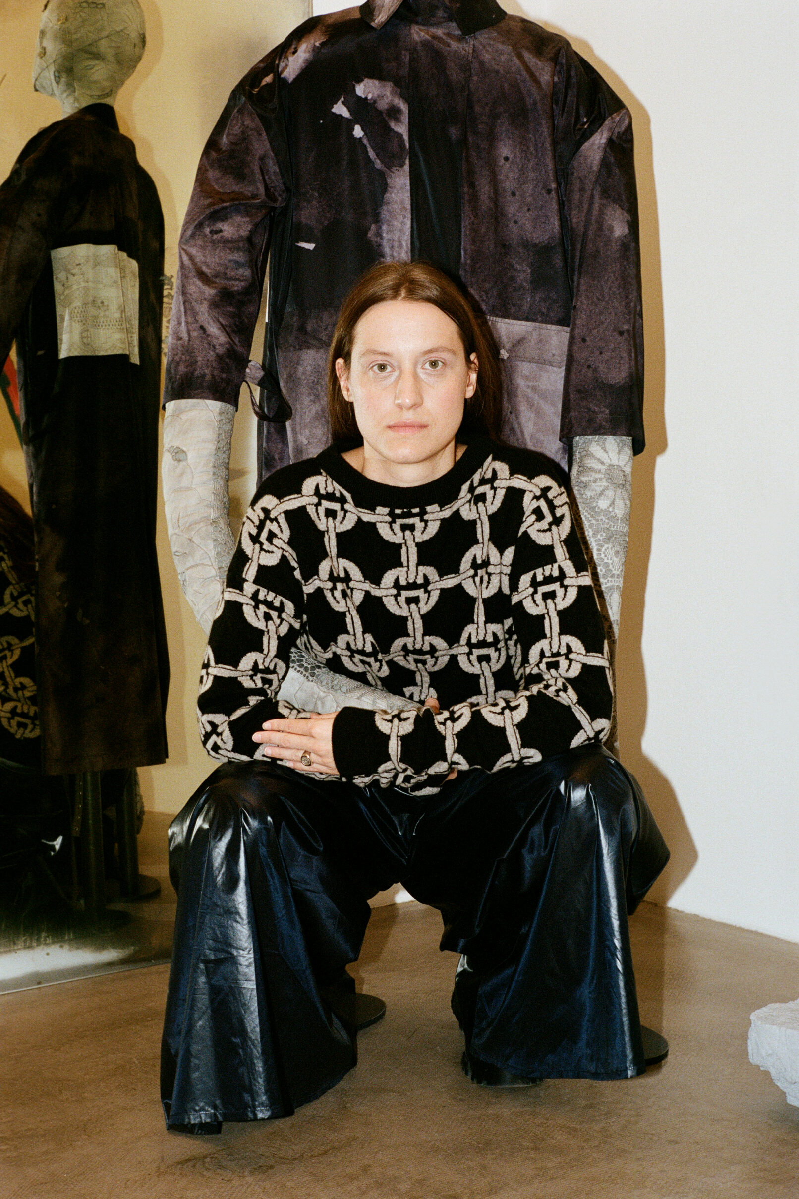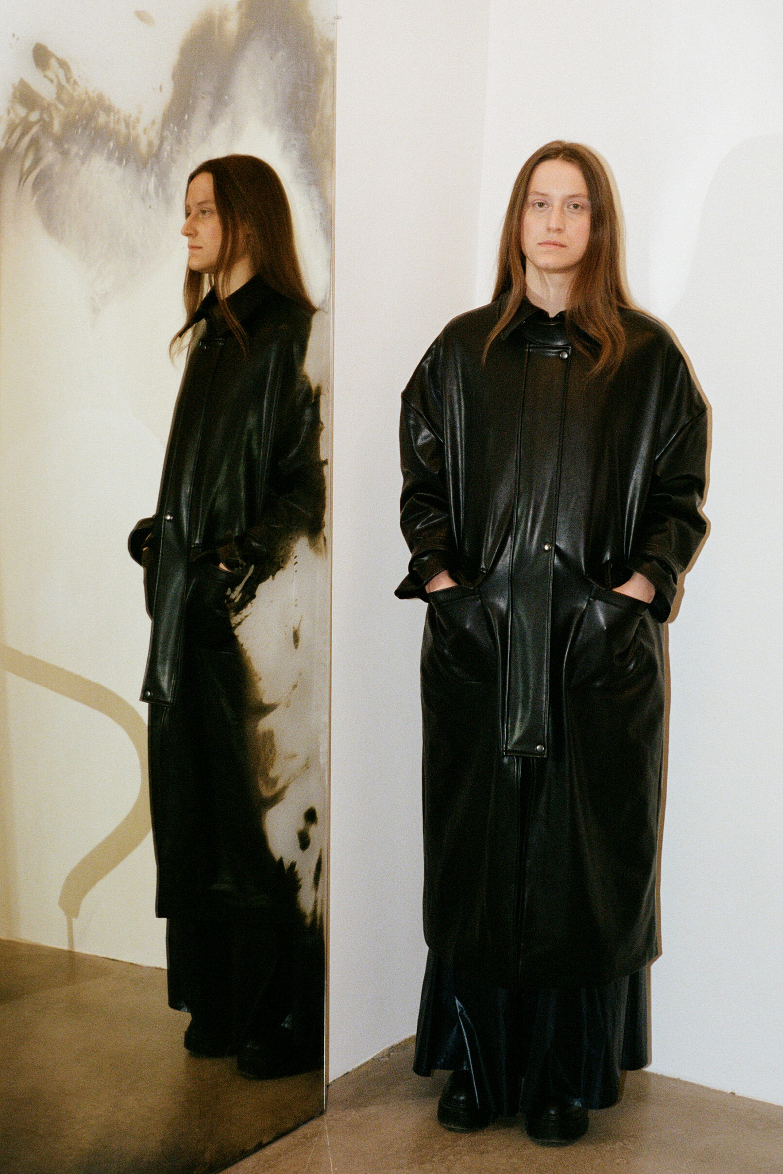 Queer qualities and non-binary cuts manifest in suits made of parachute silk, cashmere blankets, vegan leather coats. The techno-silouettes are translations of Flora Hauser’s art into wearable form, modeled by artist duo Anouk Lamm Anouk and Marleen Anouk-Roubik.