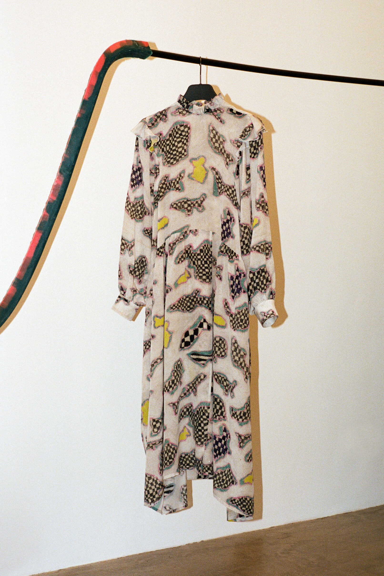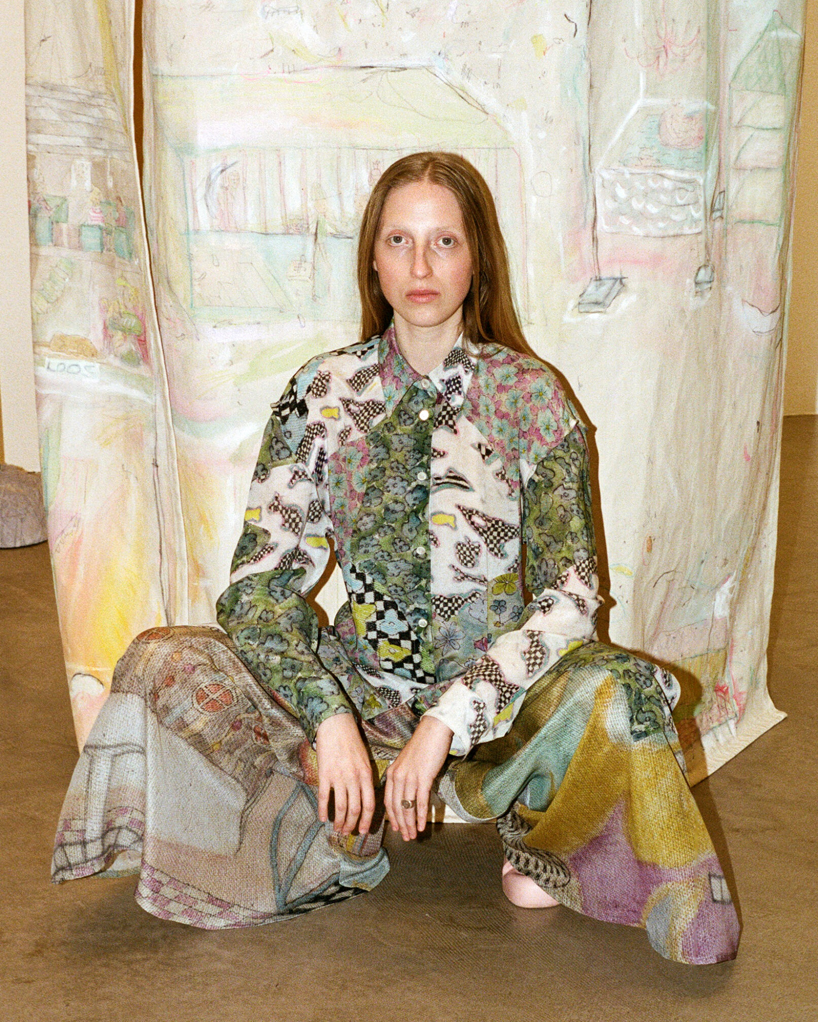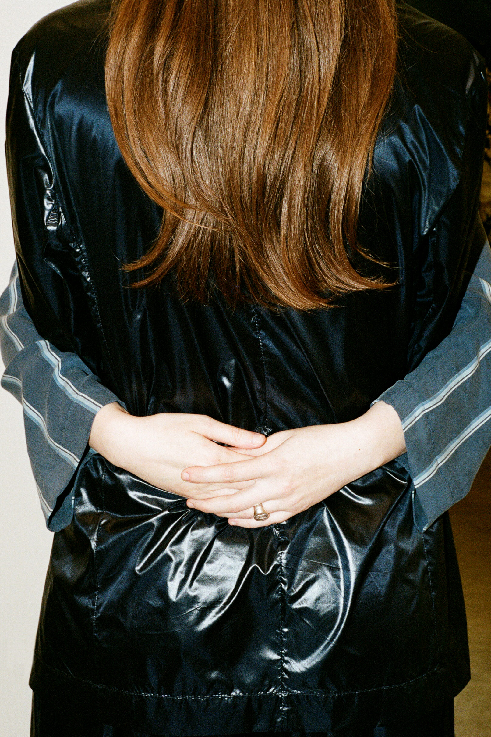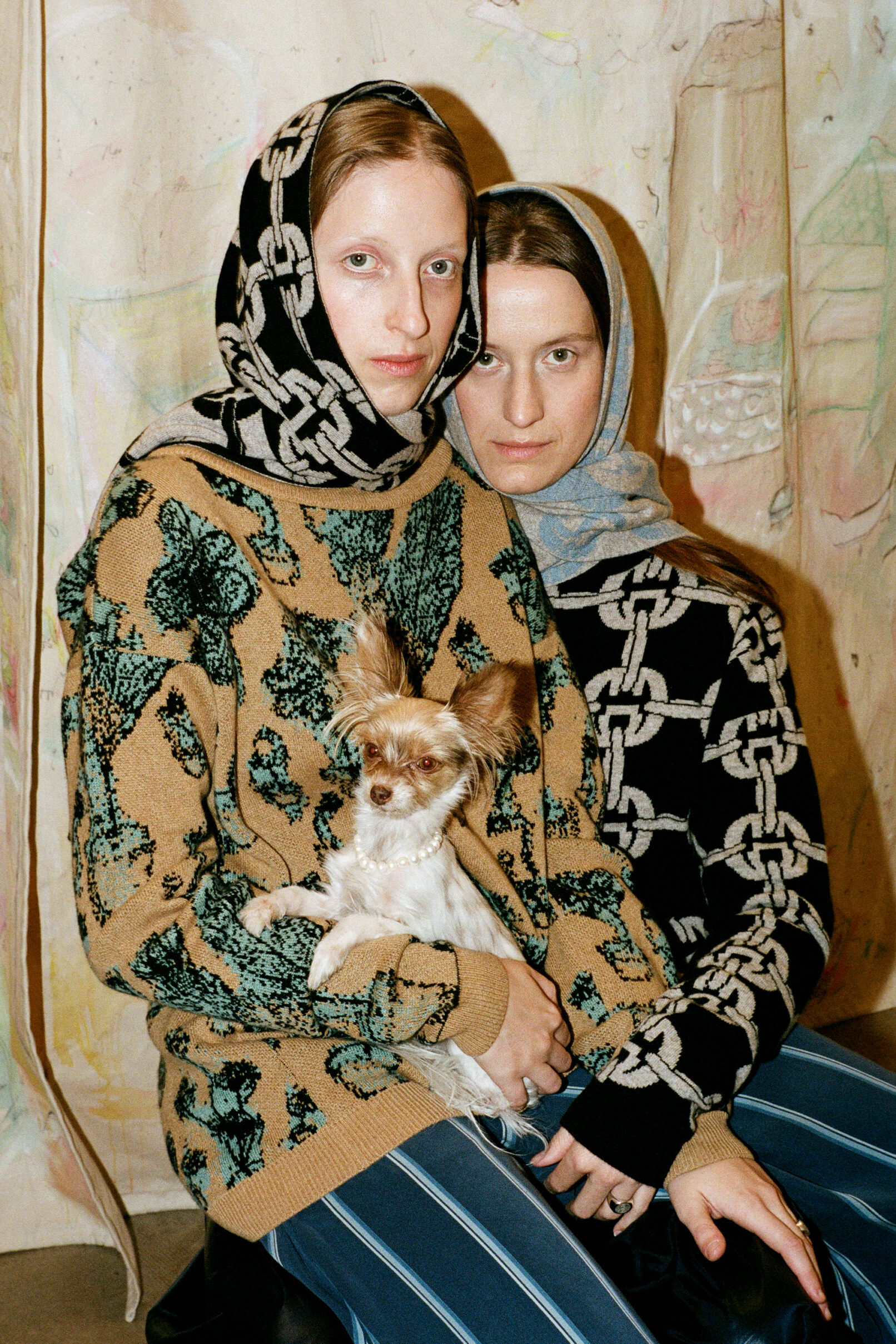Queer qualities and non-binary cuts manifest in suits made of parachute silk, cashmere blankets, vegan leather coats. The techno-silouettes are translations of Flora Hauser’s art into wearable form, modeled by artist duo Anouk Lamm Anouk and Marleen Anouk-Roubik.