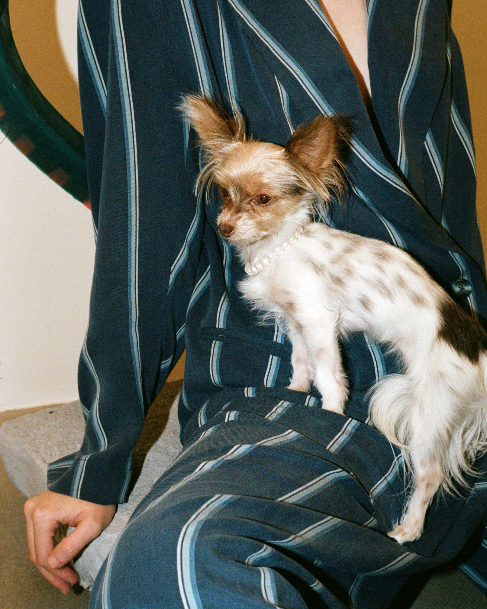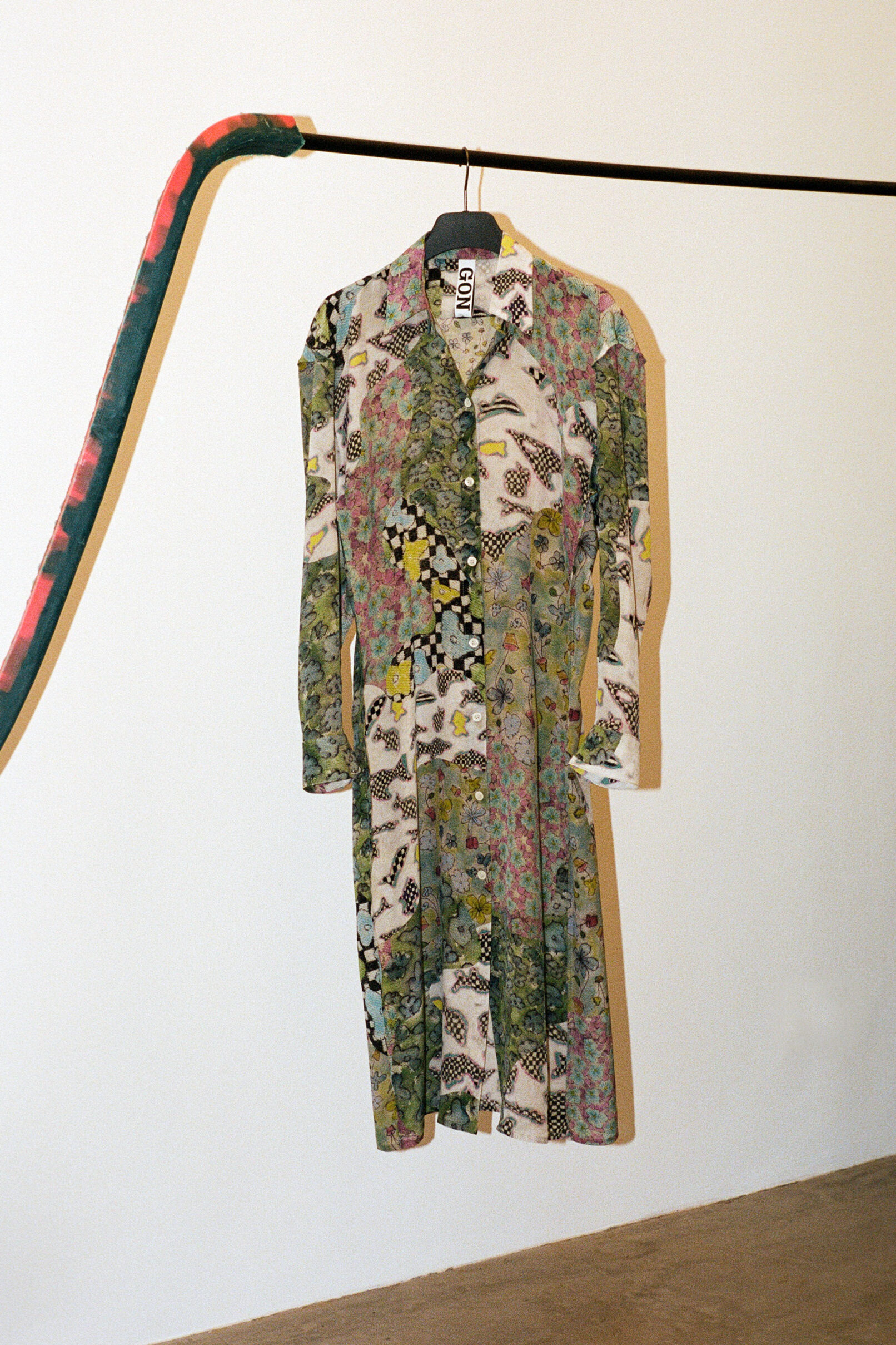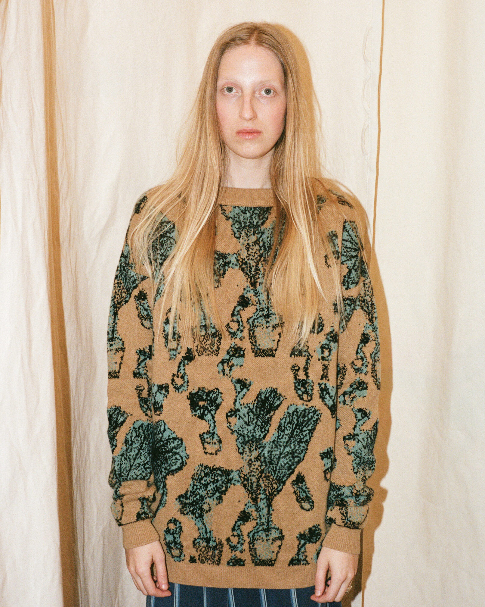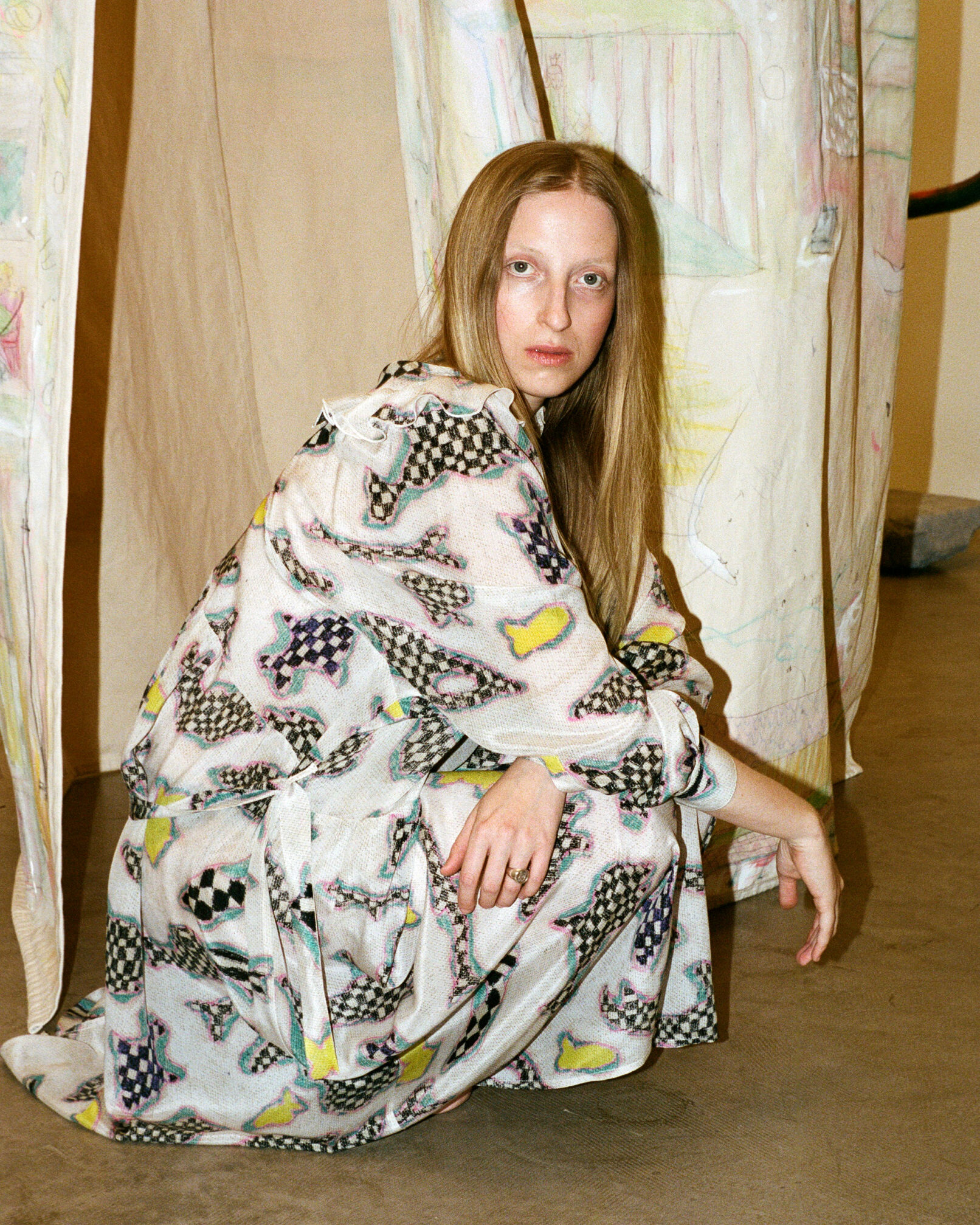 Queer qualities and non-binary cuts manifest in suits made of parachute silk, cashmere blankets, vegan leather coats. The techno-silouettes are translations of Flora Hauser’s art into wearable form, modeled by artist duo Anouk Lamm Anouk and Marleen Anouk-Roubik.
