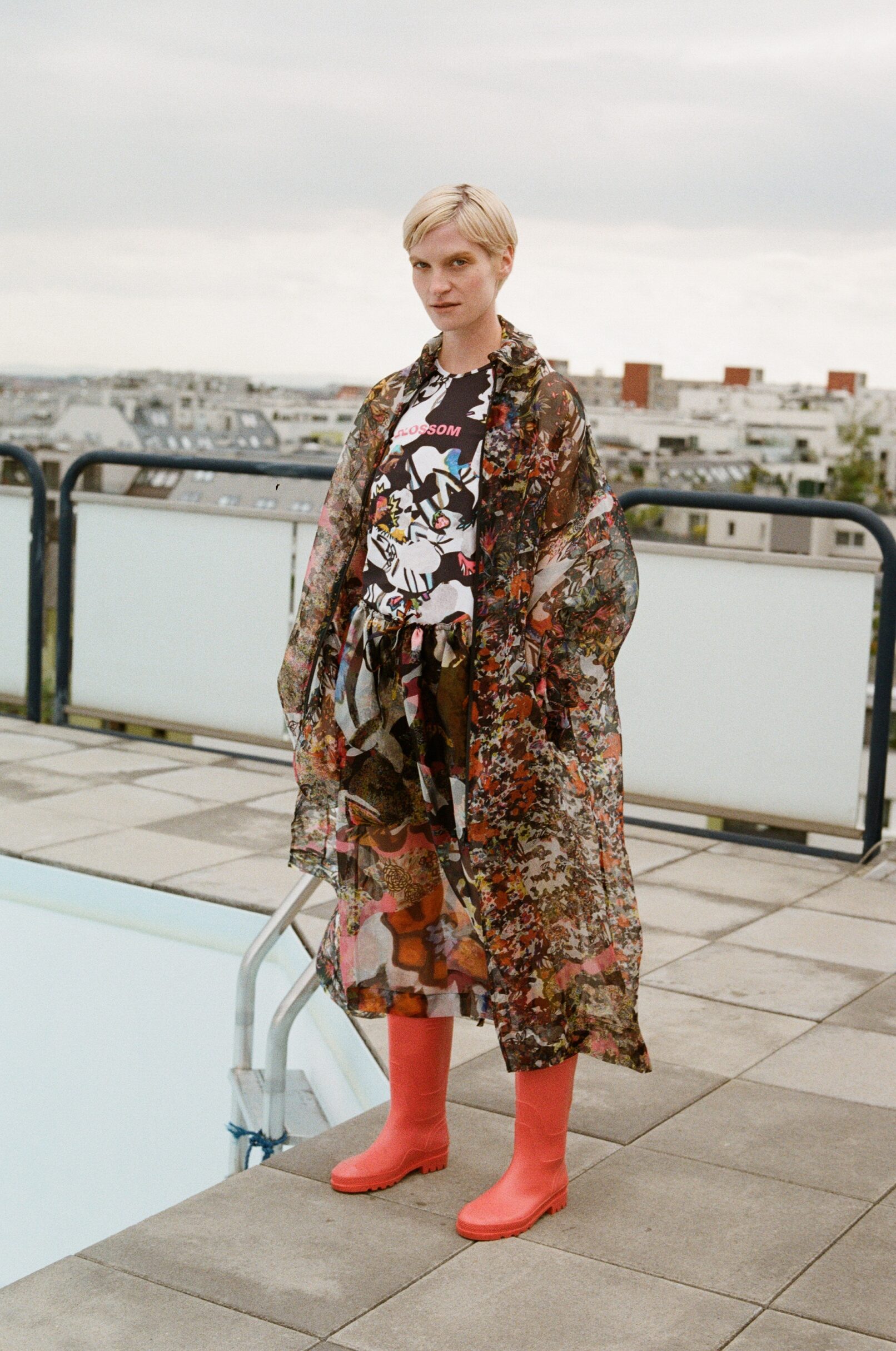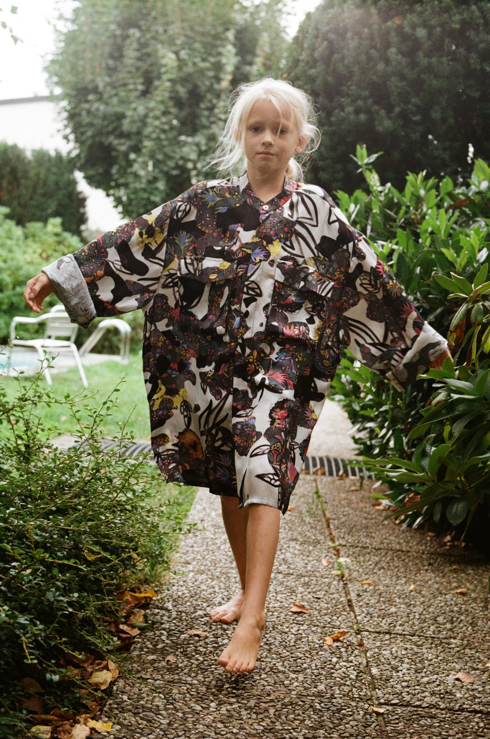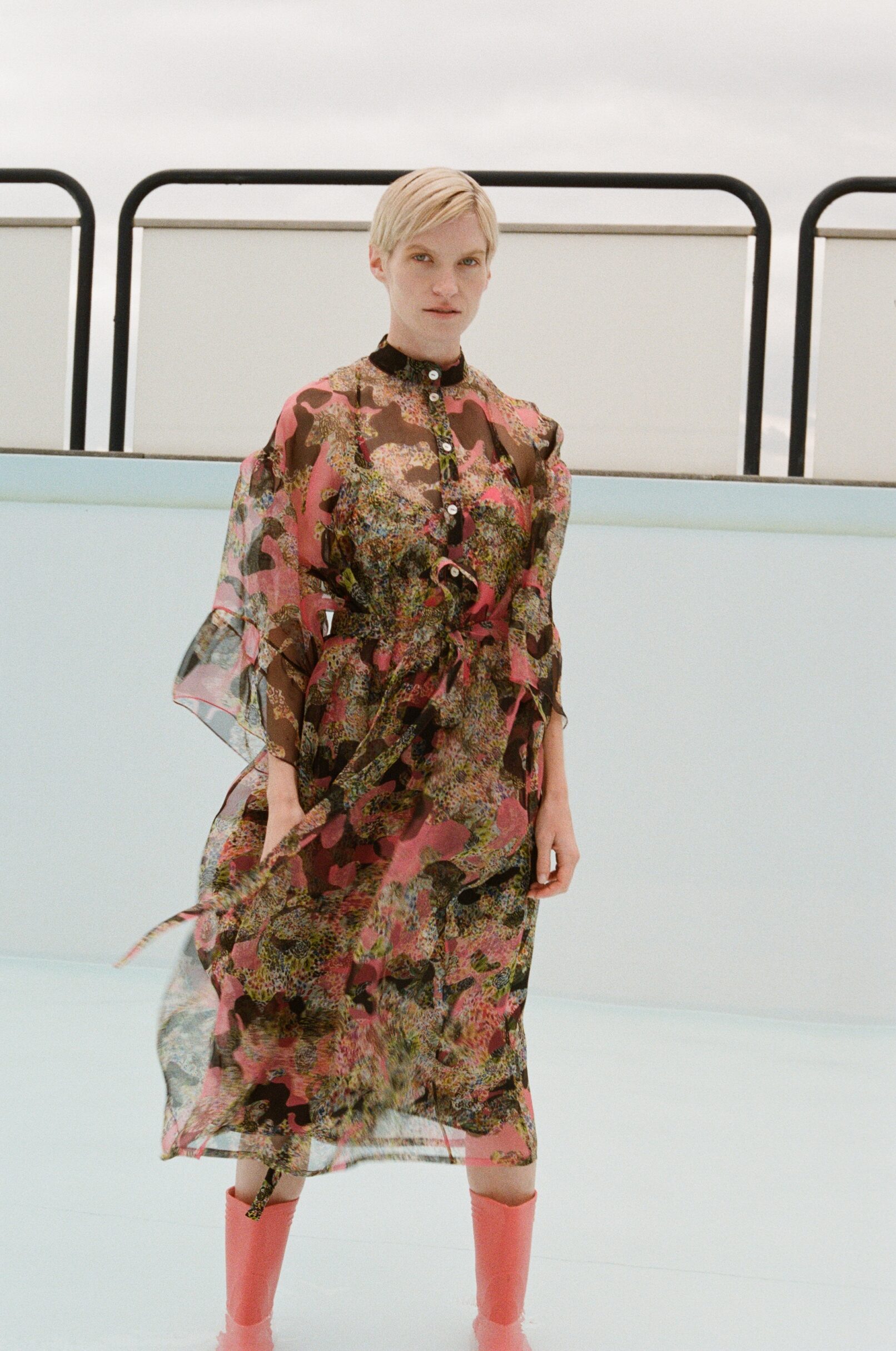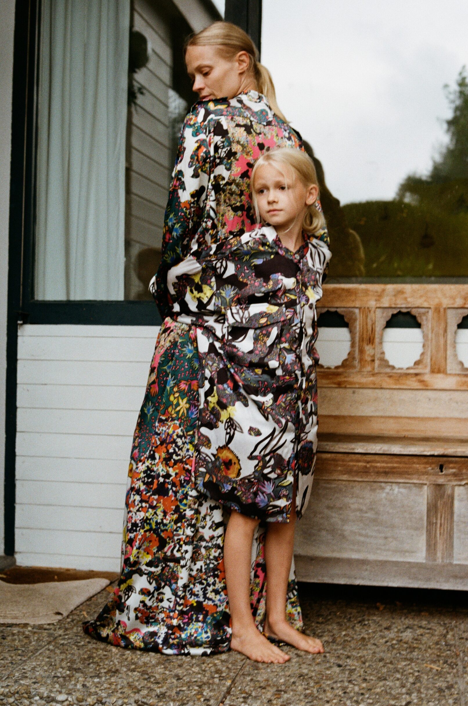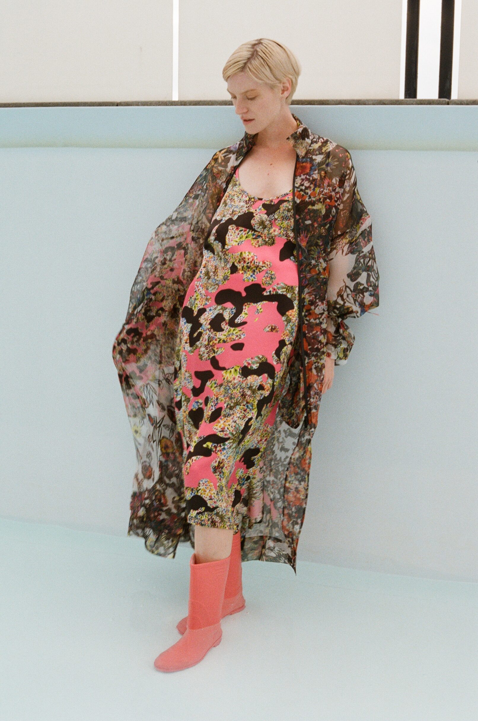 Military details and flowery camouflage create counterintuitive summer robes for intimate summer climates and family affairs.