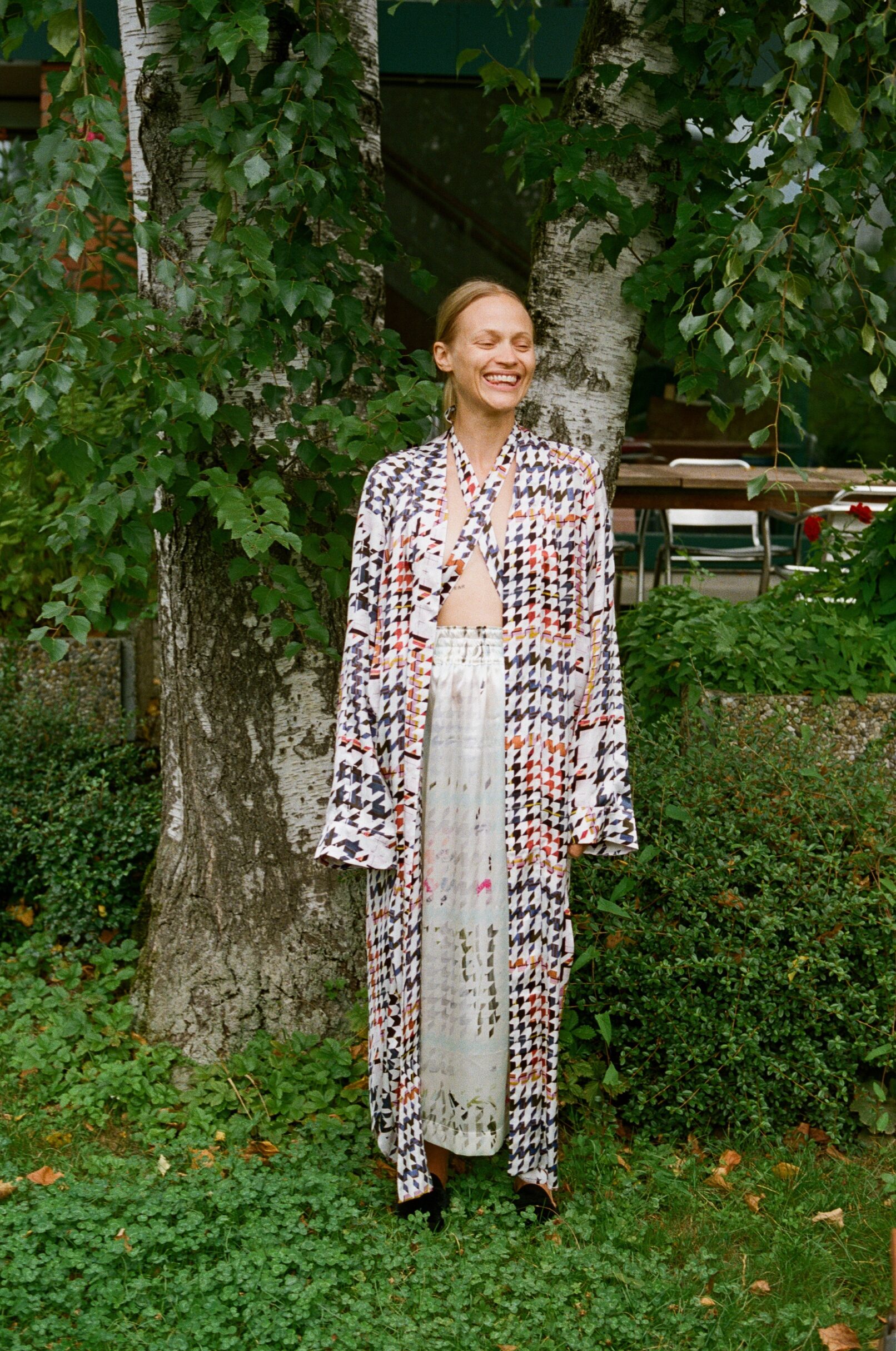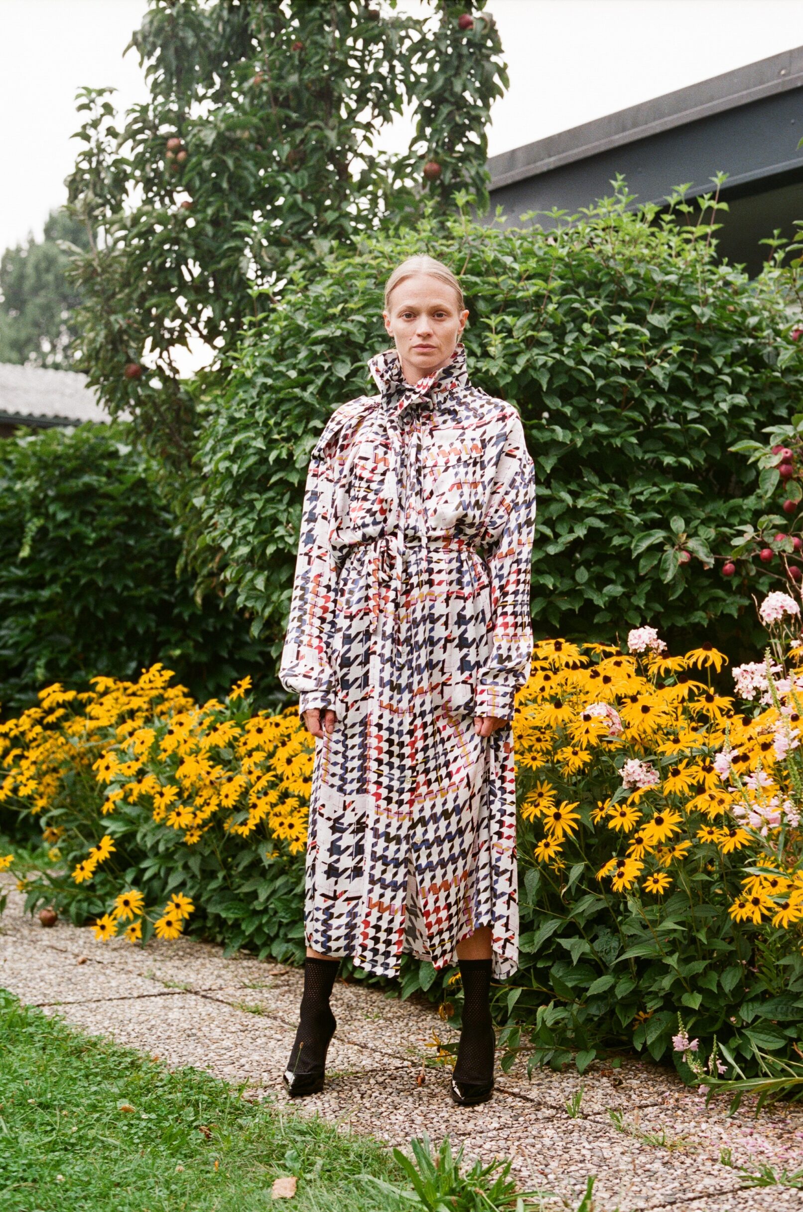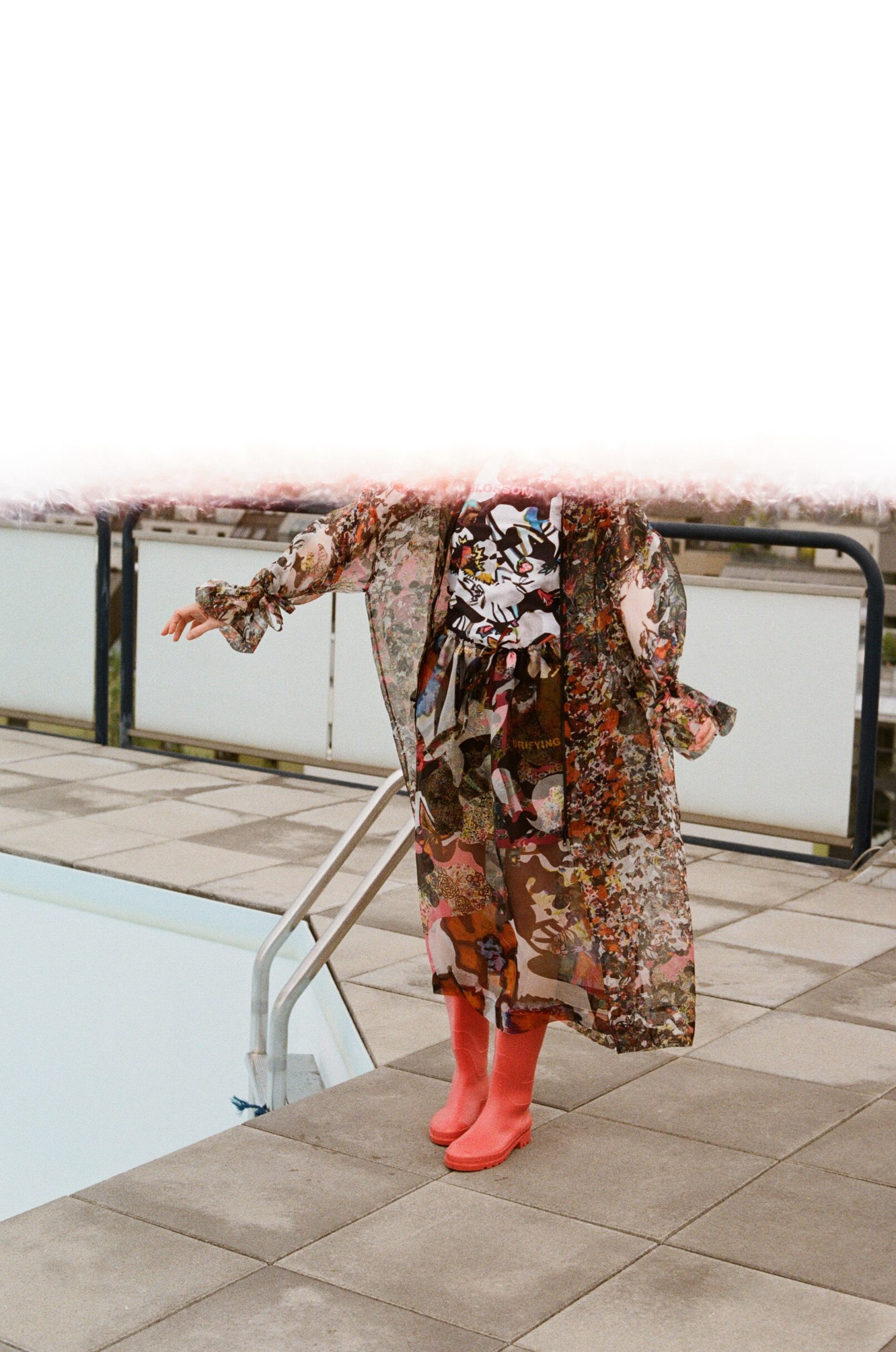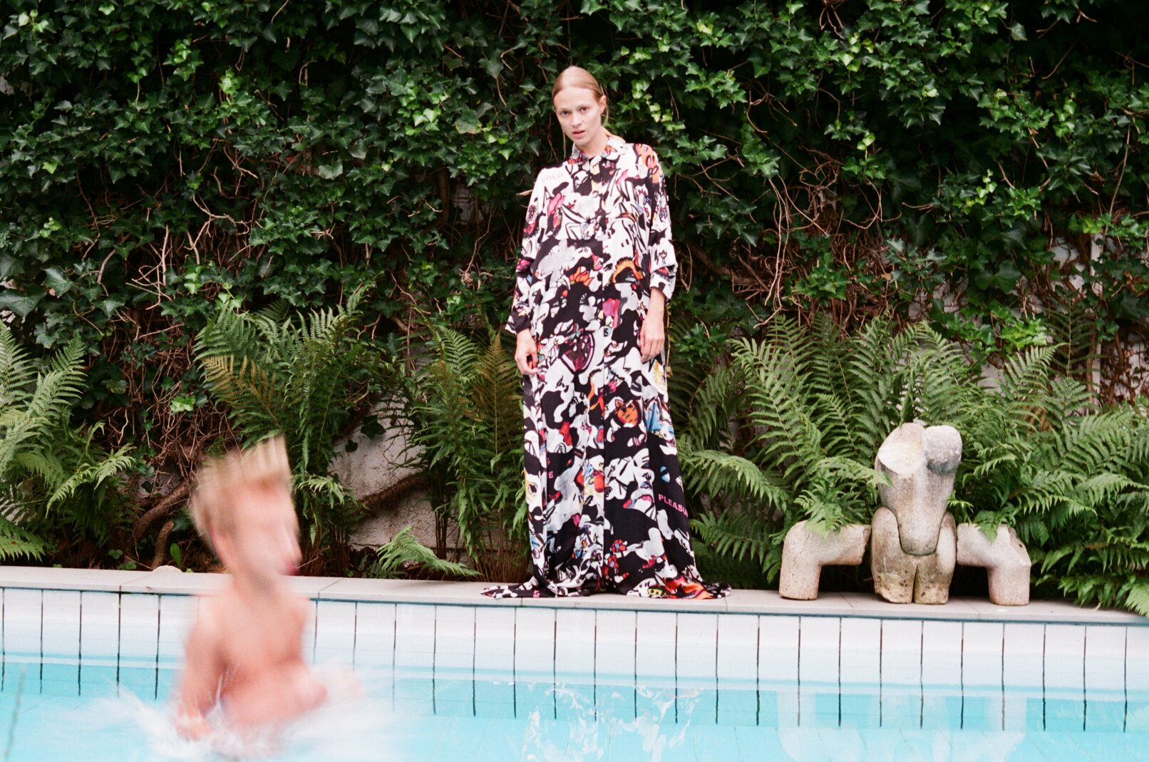 Military details and flowery camouflage create counterintuitive summer robes for intimate summer climates and family affairs.