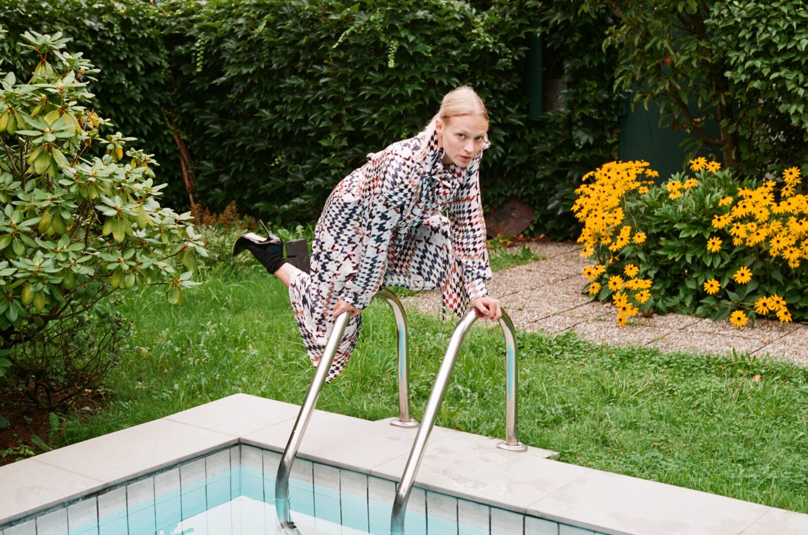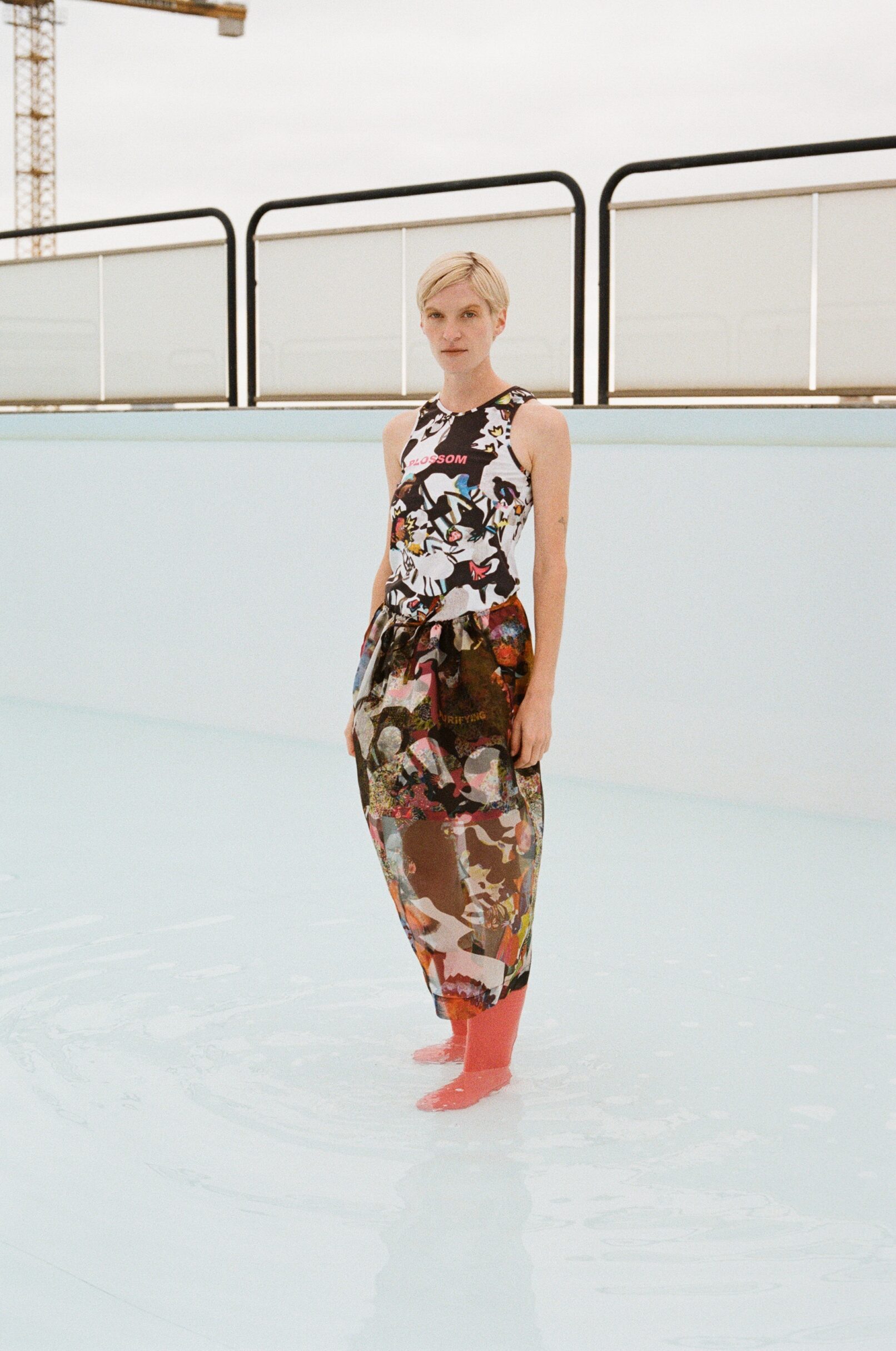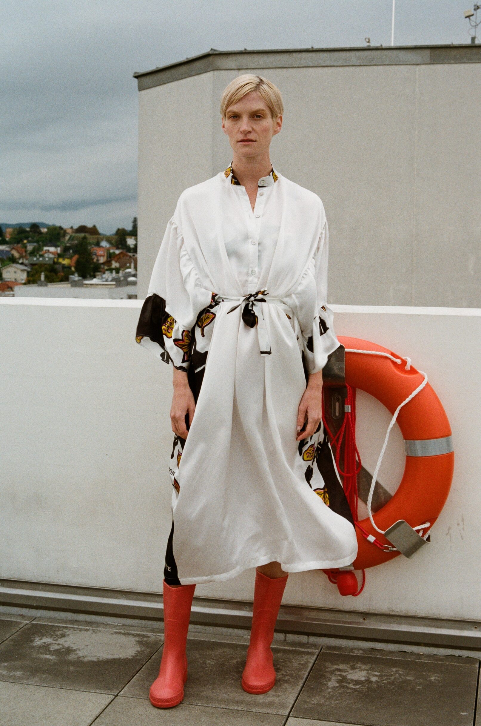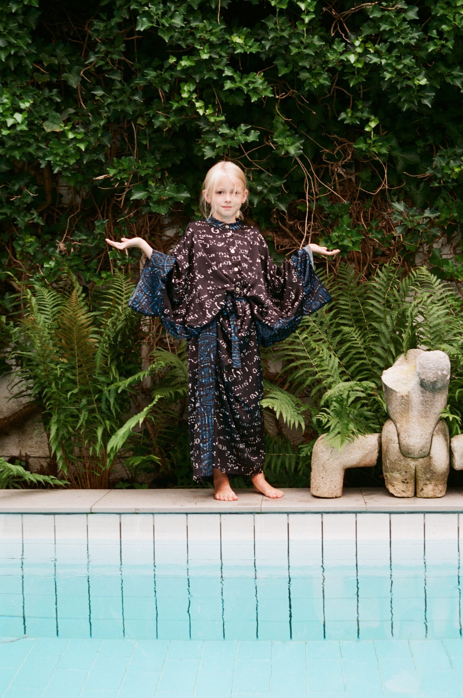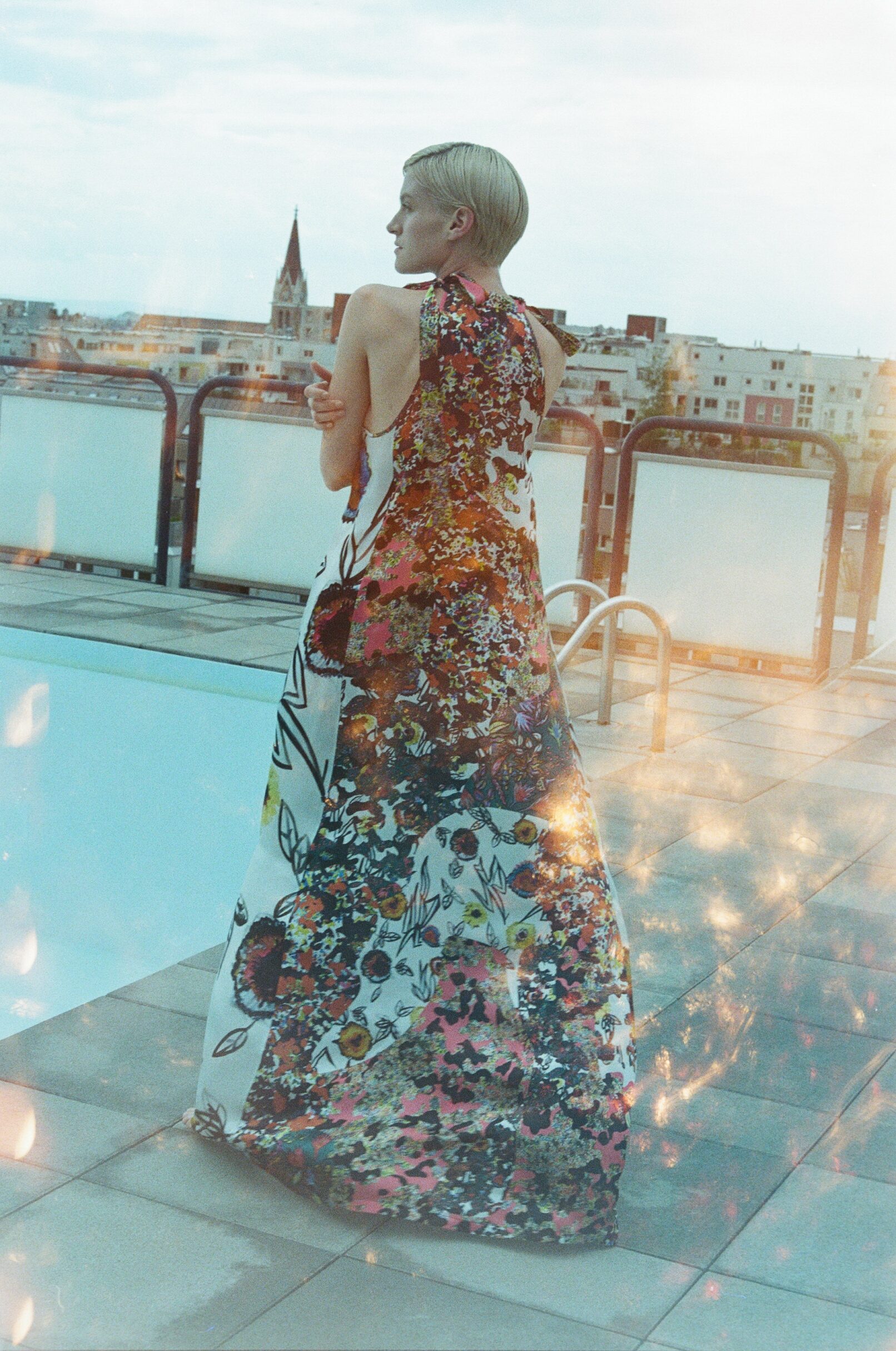 Military details and flowery camouflage create counterintuitive summer robes for intimate summer climates and family affairs.